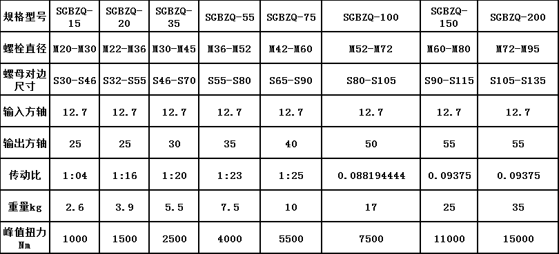 力矩放大器能特點:采用高效行星變速機構作為主傳動,體積小,重量輕,由于變速比大,輸入較小力量就能產生很大的輸出扭矩,反作用支腳可360o任意調換位置;操作人員只需施加很小的力,即可得到4-40倍的輸出力矩.配套扭力扳手根據傳動比預置好扭力,達到相應的預緊扭矩,能自動發出訊號“嗒”的一聲報警,同時伴有明顯的手感振動,從而輕捷的完成螺栓螺母的緊固拆卸工作。???